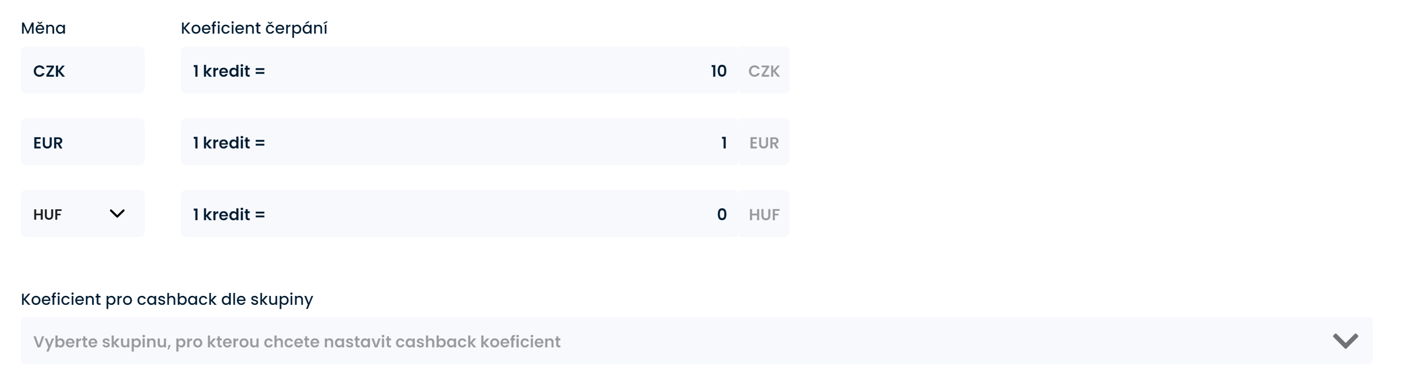 A nakonec potřebujete nastavit hodnotu bodů při uplatnění cashbacku. Jedná se o nastavení koeficientů stejně jako je popsáno v základních pravidlech systému. Koeficienty pro cashback jsou nezávislé od nastavení koeficientů čerpání. A je možné je nastavit pro každou zákaznickou skupinu samostatně, což se hodí hlavně v rámci VIP programu. Chcete-li například pro některou skupinu cashback zakázat, nastavte koeficient na 0.