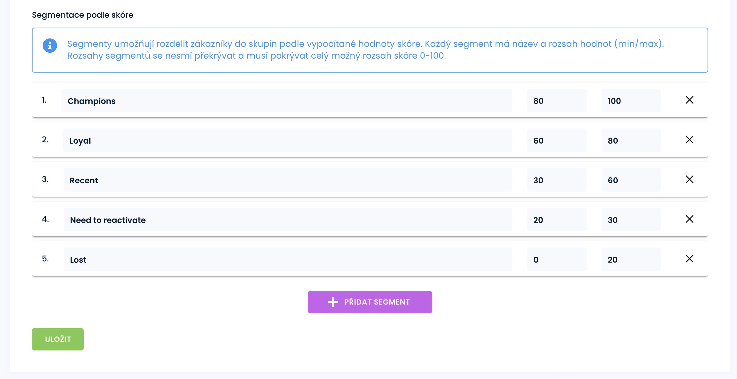 V sekci Segmentace podle skóre vytvořte segmenty s rozpětím 0–100 (viz obrázek „Segmentace podle skóre“).