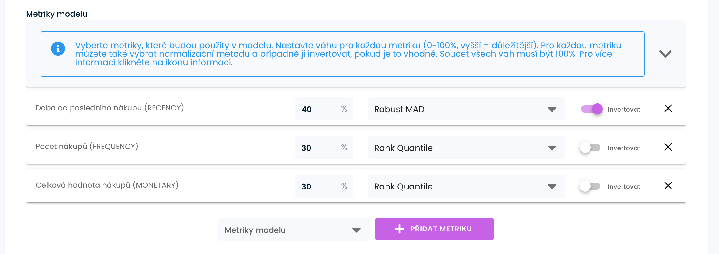 Invertování mění směr škály metriky. Když je metrika invertována, nižší hodnoty dostanou vyšší skóre a naopak. To je užitečné pro metriky, kde 'lepší' znamená nižší hodnotu (např. recency - doba od posledního nákupu).