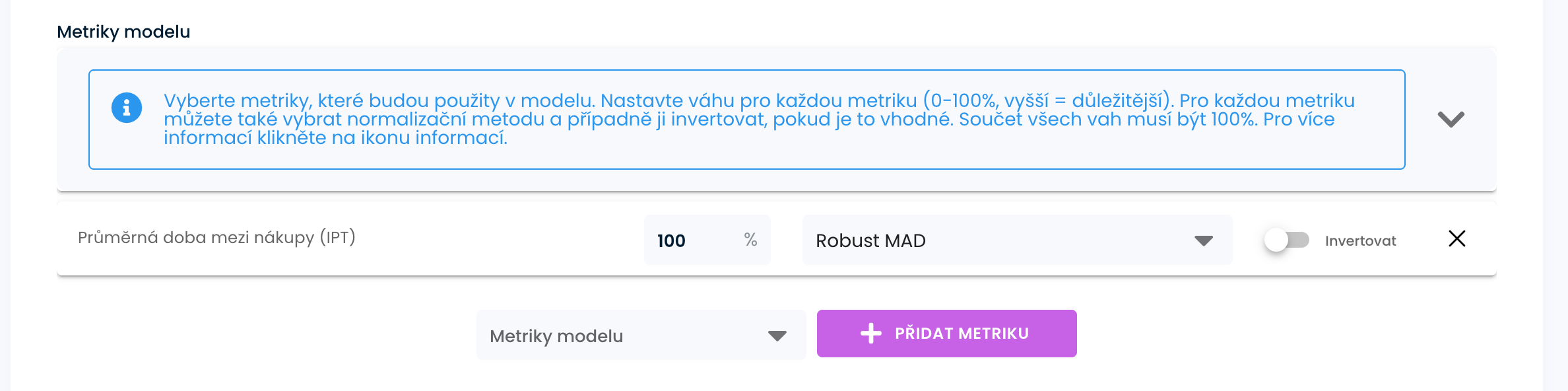 V sekci Metriky modelu vyberte metriky a nastavte jejich váhy (0–100 %, vyšší = důležitější).