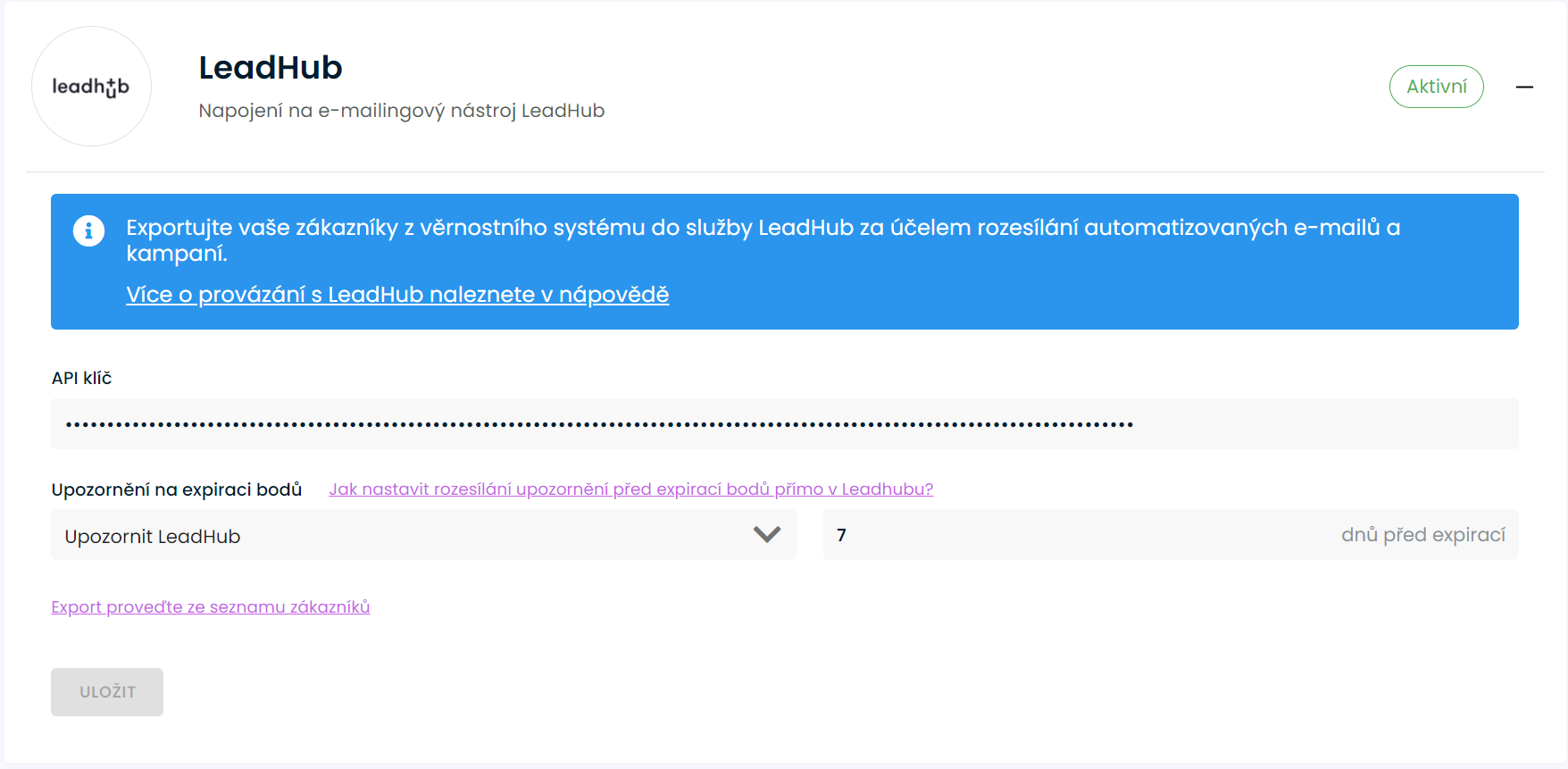 Po aktivaci můžete nastavit integraci tak, aby odesílala notifikaci o expiraci bodů v předstihu daném počtem nastavených dnů. Chcete-li odesílat nastavení, zvolte v prvním poli Upozornit LeadHub a ve druhém poli zadejte počet dnů před expirací, kdy chcete notifikaci posílat. Nechcete-li notifikace posílat, nastavte na Neodesílat. Poté stiskněte tlačítko Uložit.