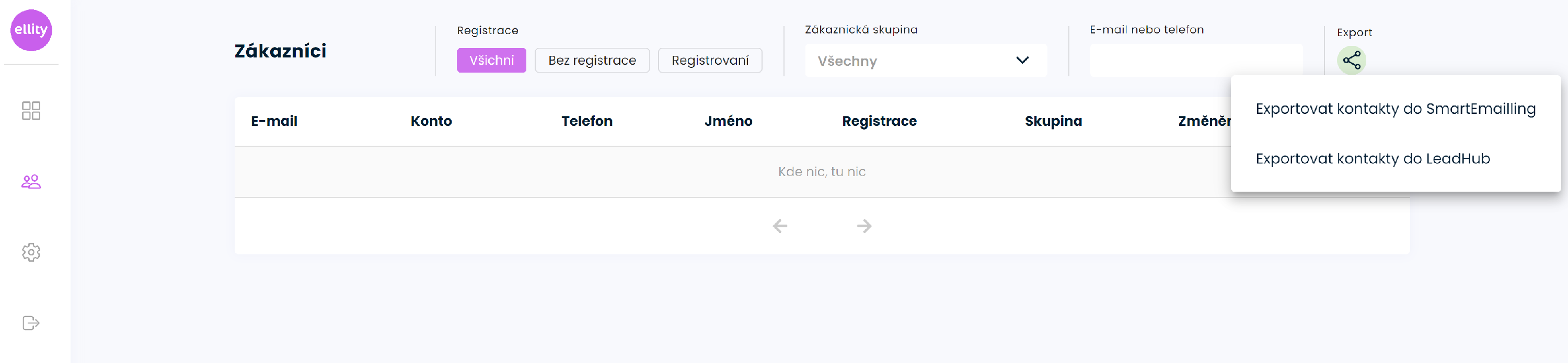Po aktivaci je vhodné poslat konta a základní údaje z věrnostního systému do LeadHub. To provedete jednorázovým exportem. Chcete-li provést jednorázový export všech zákazníků, přejděte do Seznamu zákazníku a stiskněte vpravo nahoře tlačítko pro export. Dojde k exportu všech současných zákazníků v systému. V LeadHub se k záznamu (neexistující e-mail se založí) přidá nový značka číslo 1 (ellity_account_changed) s hodnotou konta a dalšími údaji.