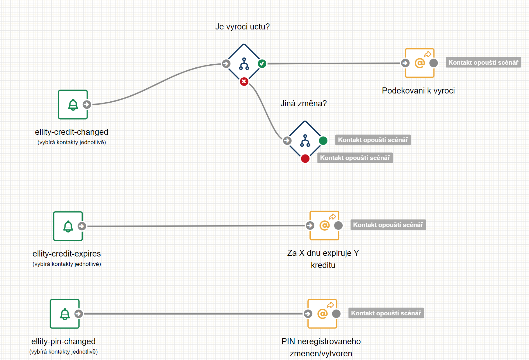 - změna konta zákazníka (ellity-credit-changed): posílá se počet bodů a důvod změny. Na základě důvodu můžete podmínkovat rozesílání specifických e-mailů.