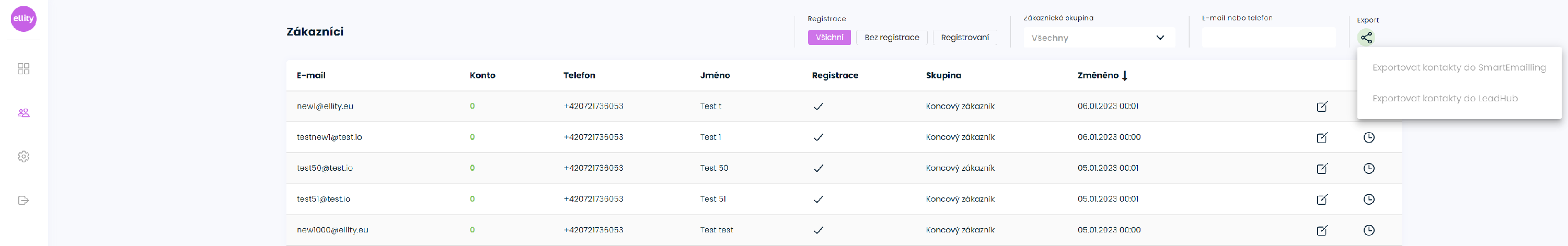 Údaje o zákazníkovi se do SmartEmaillingu posílá při vytvoření nebo změně údajů na zákazníkovi automaticky. Chcete-li provést jednorázový export všech zákazníků, přejděte do Seznamu zákazníku a stiskněte vpravo nahoře tlačítko pro export. Dojde k exportu všech současných zákazníků v systému. Ve SmartEmaillingu se buď založí nový záznam nebo se aktualizuje stávající. Toto je vhodné provést po první aktivaci integrace.