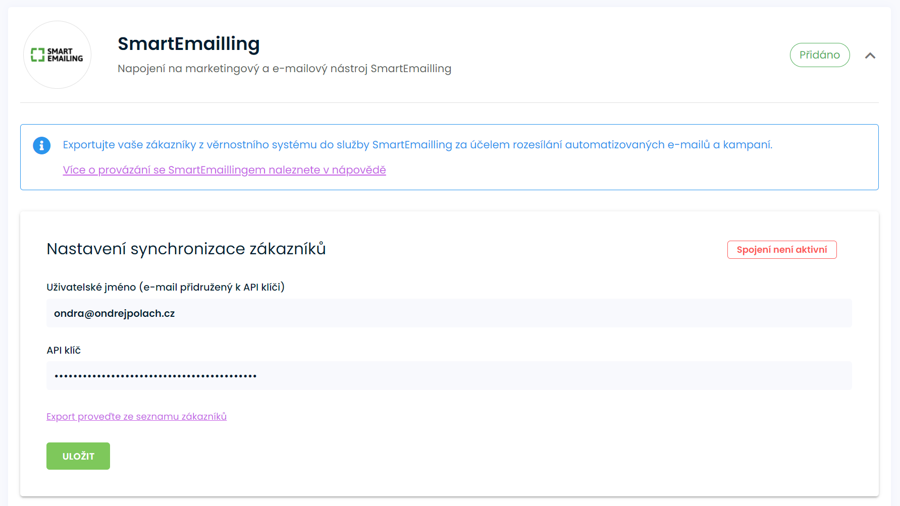 V nastavení přejděte do sekce Integrace. Pokud ještě nemáte přidanou funkci Integraci SmartEmailling, přidejte ji. Nyní musíte vyplnit uživatelské jméno a API klíč. Obě hodnoty naleznete ve svém SmartEmailling účtu v menu Můj účet - API klíče. Jako uživatelské jméno použijte e-mail, který je zobrazen nad tlačítkem Vytvořit API klíč. Nemáte-li ve svém účtu API klíč, vytvořte si jeden stiskem tohoto tlačítka.