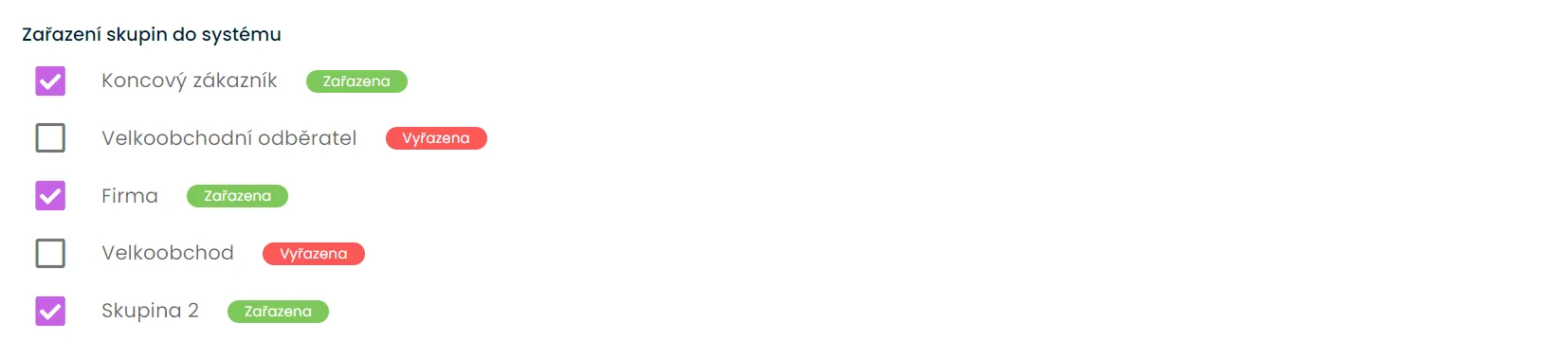 Podobně můžete zařadit/vyřadit zákaznické skupiny. Pokud je zákazník v zakázané skupině, věrnostní systém se mu po přihlášení do e-shopu nezobrazuje a nezískává body a ani je nemůže uplatnit. Systém pro něj neexistuje. Zákaznická skupina hraje důležitou roli v nastavení koeficientů nabíjení a čerpání. Více se o nich dozvíte v pokročilém nastavení koeficientů.