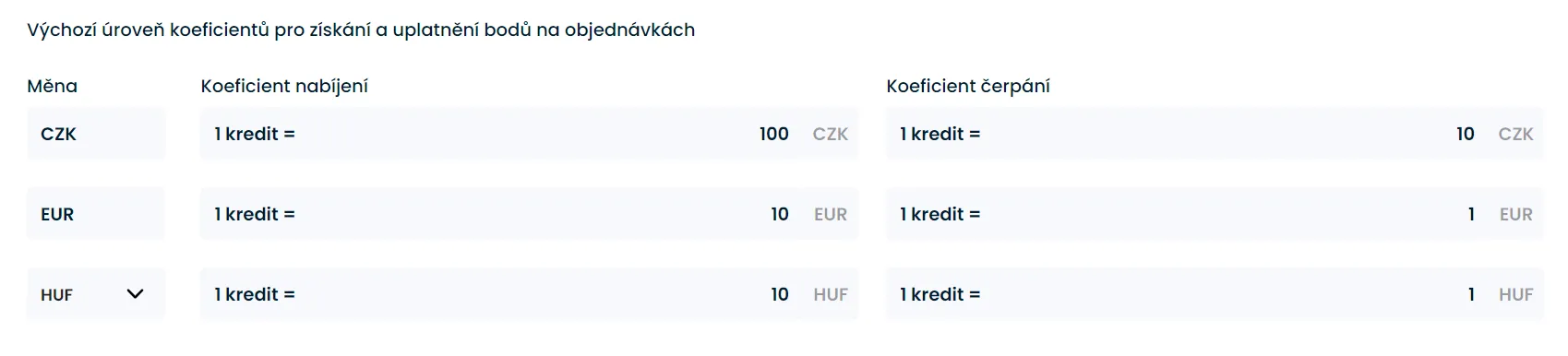 Koeficienty nastavujete samostatně pro různé měny. V nastavení se vám vždy zobrazí první dvě hlavní měny a ostatní měny (jsou-li v e-shopu použity) se schovají pod výběrové tlačítko na posledním řádku, jak je vidět na obrázku výše.