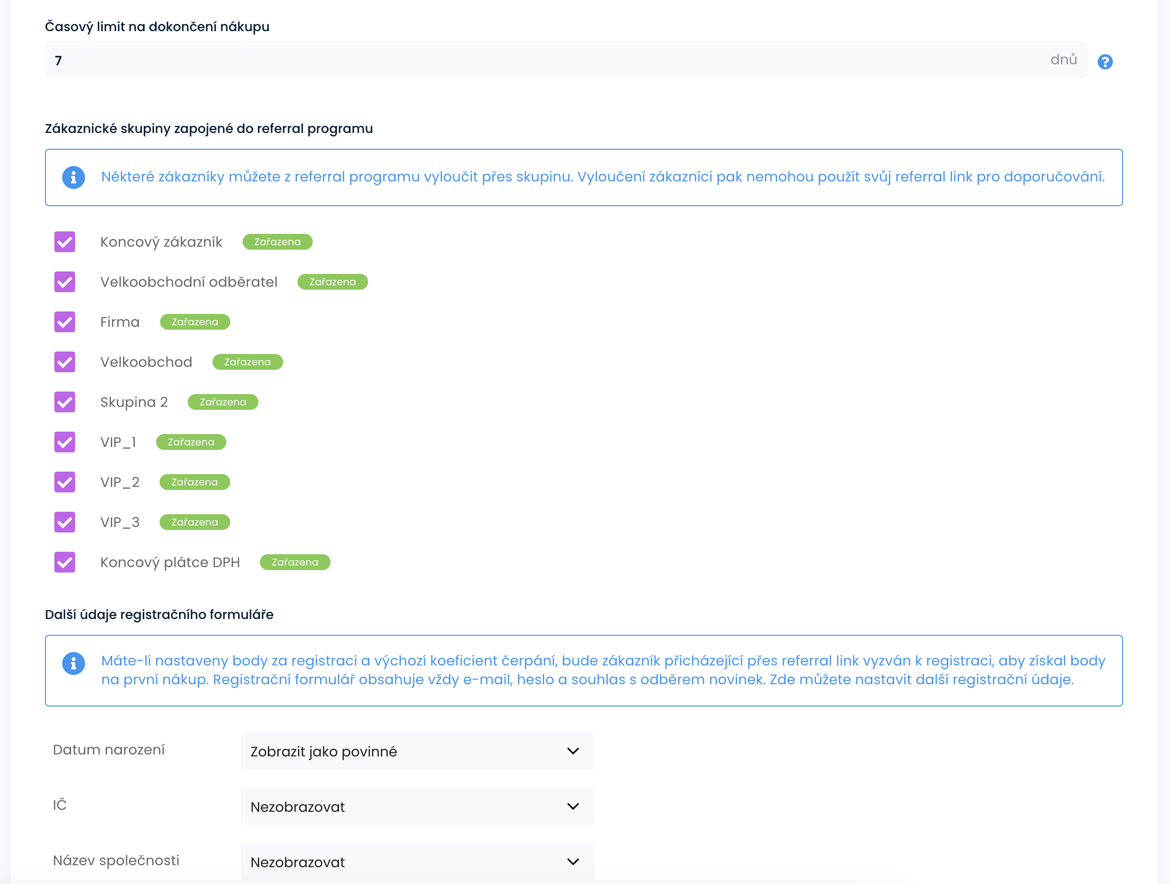 Další nastavení se týká povolení referral programu pro určité skupiny zákazníků a nastavení formuláře, který se zobrazí po vstupu na e-shop přes referral link.