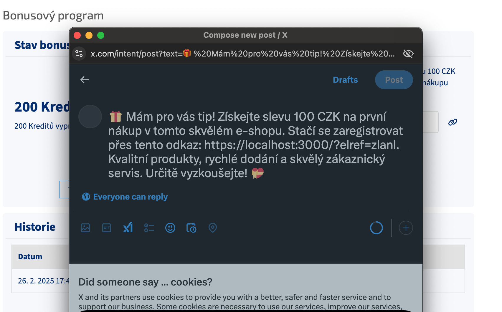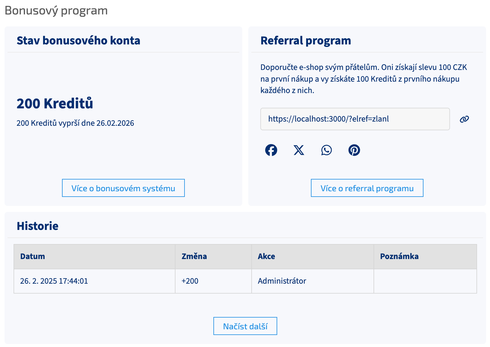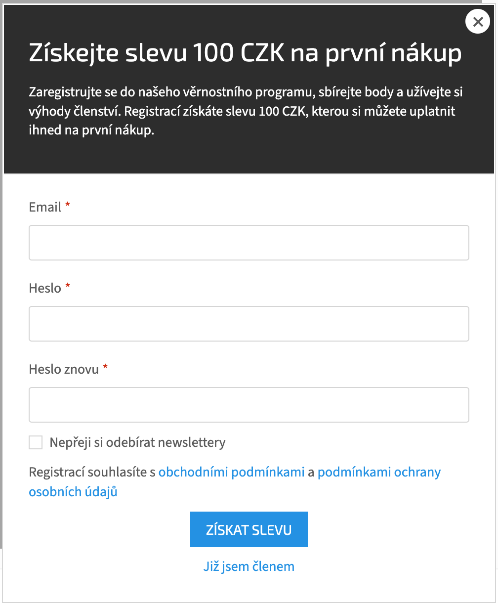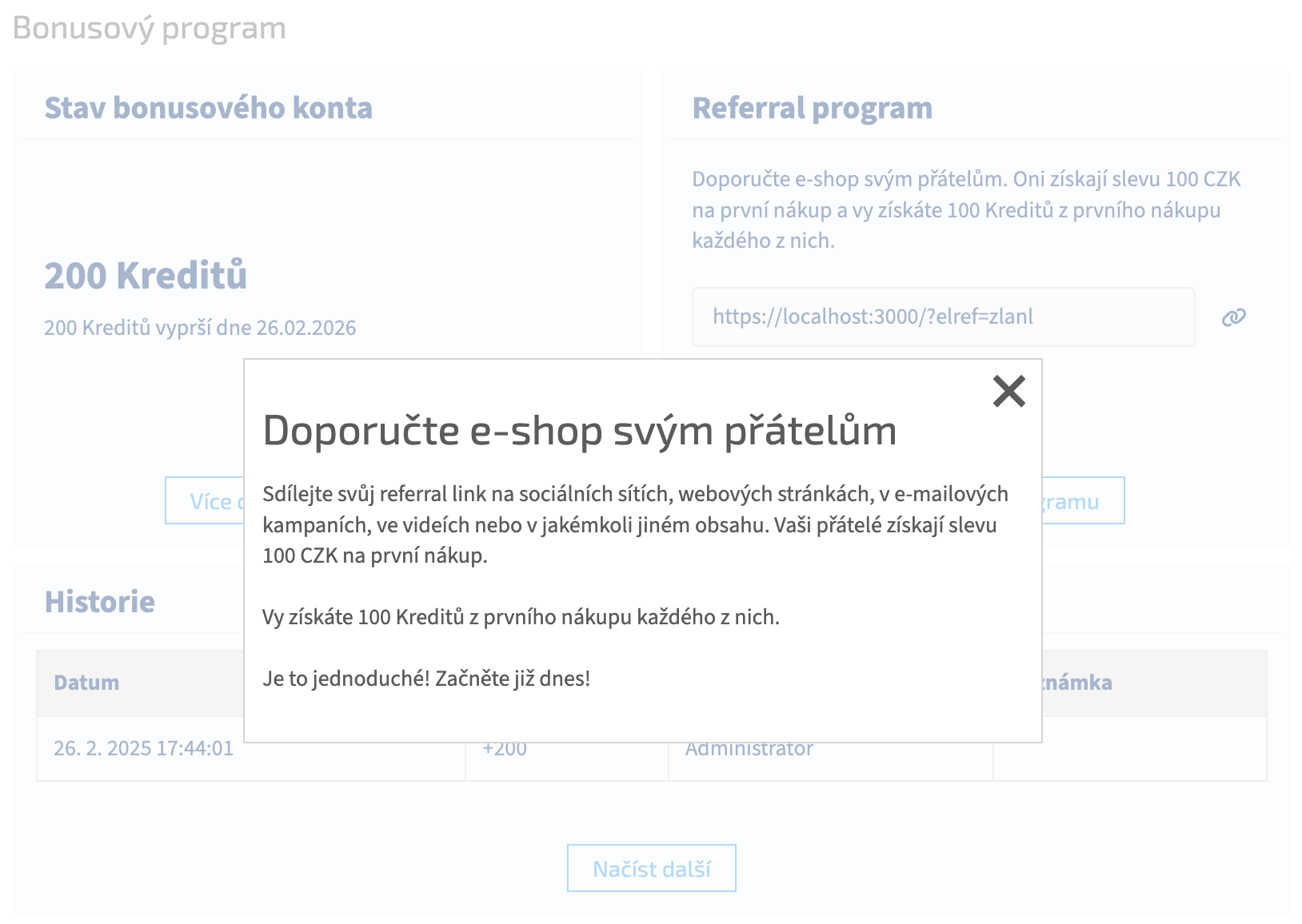 - Při vstupu nového zákazníka na e-shop s referral linkem je zobrazen registrační formulář s informací o odměně na první nákup. Odměna na první nákup je spočítána z koeficientu čerpání a bodech za registraci (například 1bod=1CZK a registrace=100bodů rovná se 100 CZK).