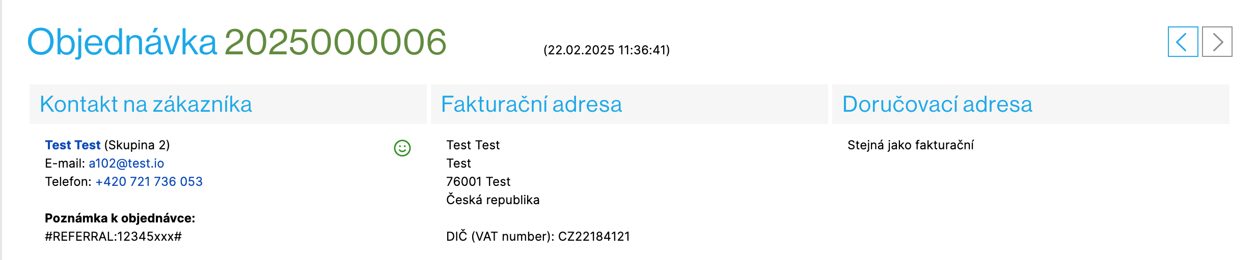 - Při odesílání objednávky je referral kód vložen na pozadí do poznámky objednávky ve formátu #REFERRAL:xxxxxxx#. Takto může Ellity připsat body stávajícímu zákazníkovi jako odměnu za přivedení nového zákazníka.