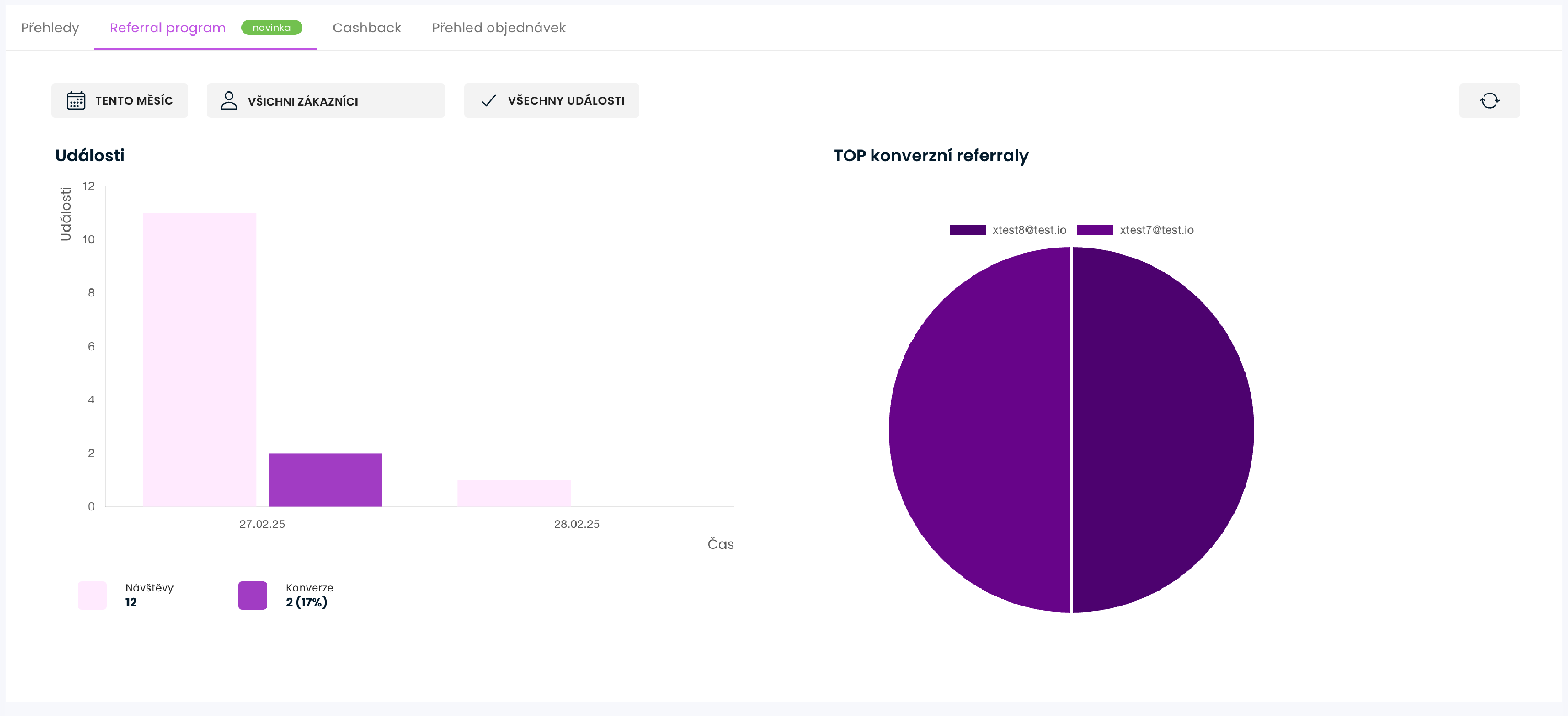 V konzoli Ellity vidíte přehled používání referralů v čase. Vidíte podíl návštěv a konverzí. Také máte k dispozici TOP konverzní referraly, tedy zákazníky jejichž referraly byly nejvíce použity ke konverzi za dané období. Přehled můžete filtrovat podle období, zákazníka nebo typu události (návštěva, konverze).
