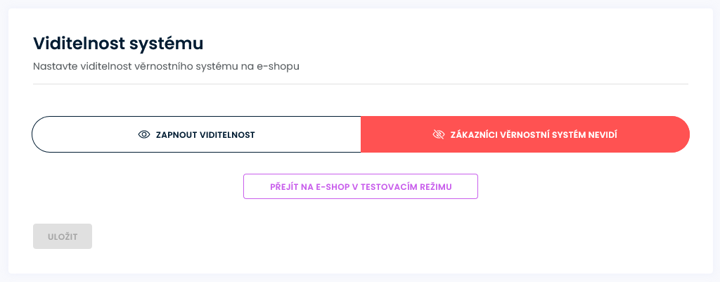 Po instalaci je systém na e-shopu standardně neviditelný. Zviditelnění je možné pouze pomocí tlačítka Viditelnost – provádí jej sám provozovatel e-shopu, jakmile je systém připraven ke spuštění.
