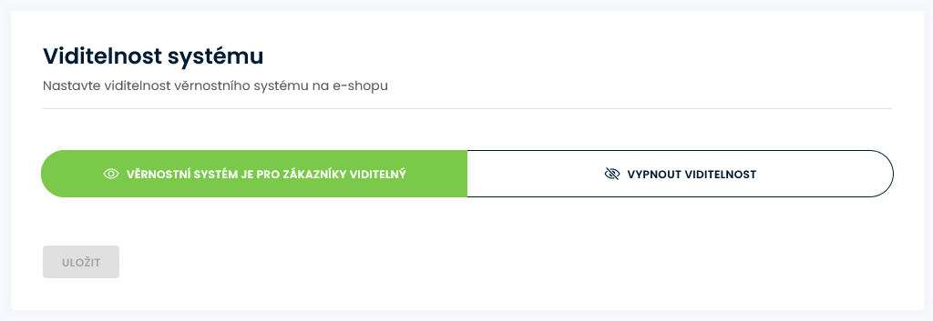 Upozornění: I při vypnuté viditelnosti systém na pozadí běží a sleduje uživatelské akce. Účty zákazníků se tak mohou načítat podle nastavených pravidel. Zákazníci však systém nevidí a nejsou o jeho činnosti informováni (neobdrží e-maily apod.). - před samotným spuštěním je možné konta zákazníkům vynulovat, aby začali od spuštění sbírat body od 0 - ozvěte se nám (my@ellity.eu)