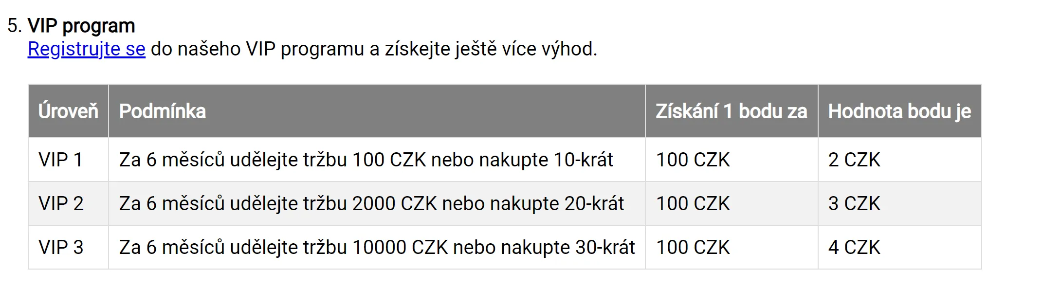 | VIP 1 | 1 bod = 1 CZK | 1000 bodů má hodnotu 1000 CZK |