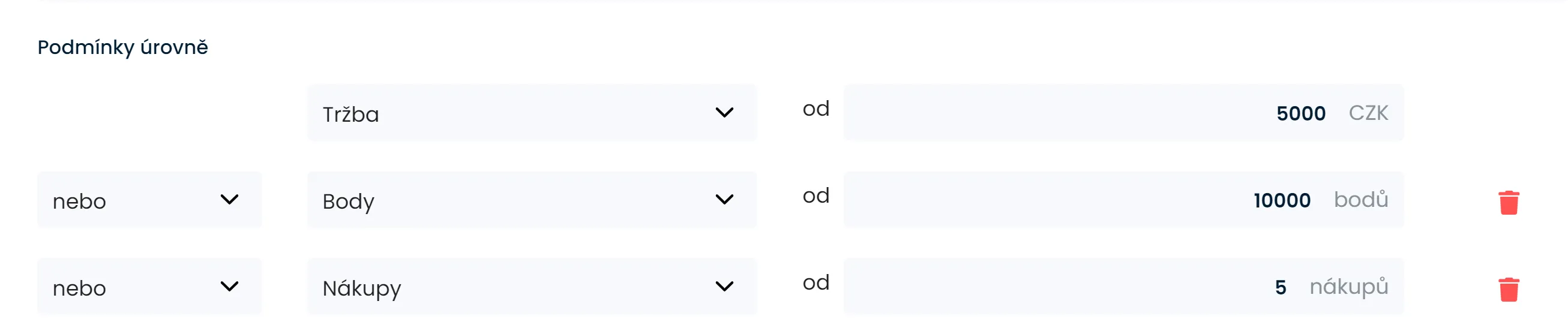 Každá úroveň má svá pravidla, která musí zákazník splnit, aby se do dané úrovně dostal. Můžete nastavit jednoduché i složitější podmínky, ve kterých můžete použít následující zákaznická data a různě je spojovat logickými spojkami a zároveň, nebo, jak je vidět na obrázku.
