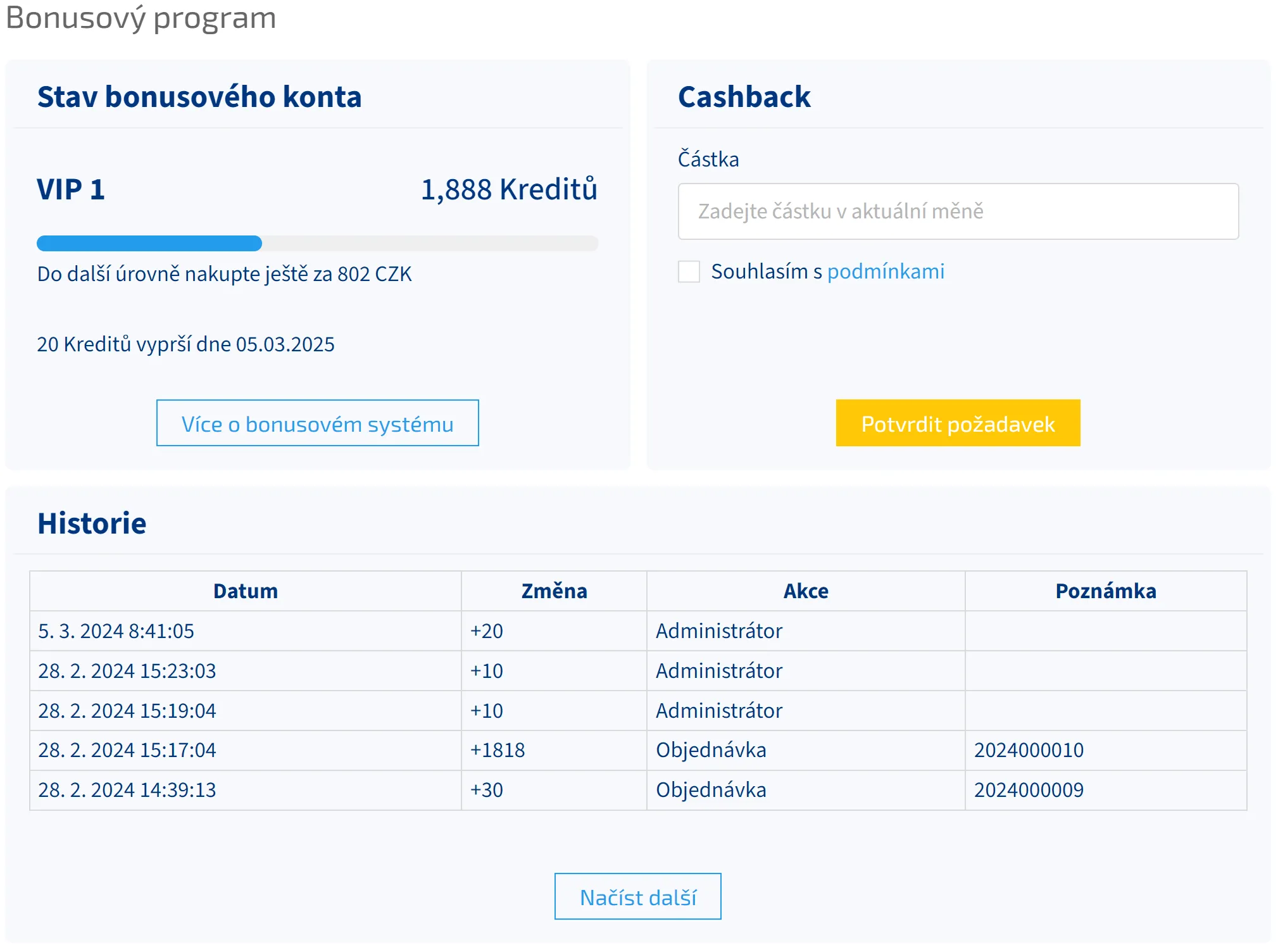 Jakmile se zákazník přihlásí do svého profilu na e-shopu, zobrazí se mu data k VIP programu. Vidí na jaké úrovni se nyní nachází (VIP 1) a kolik mu zbývá splnit do další úrovně, a to jak textově tak i grafickým progress barem. Obrázek níže ukazuje toto zobrazení spolu s dalšími typickými panely.