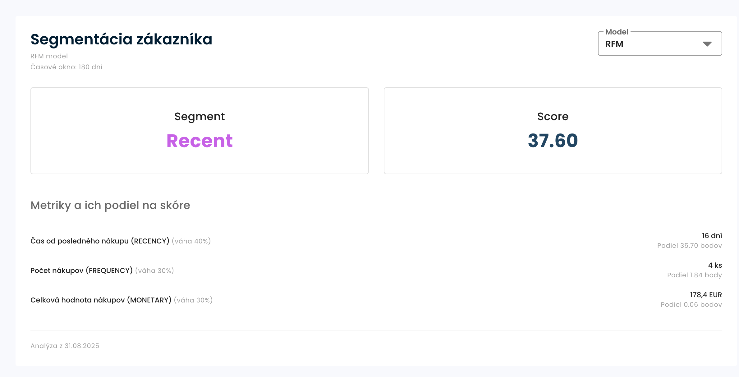 - Recency - 16 dní (skóre: 35.70)