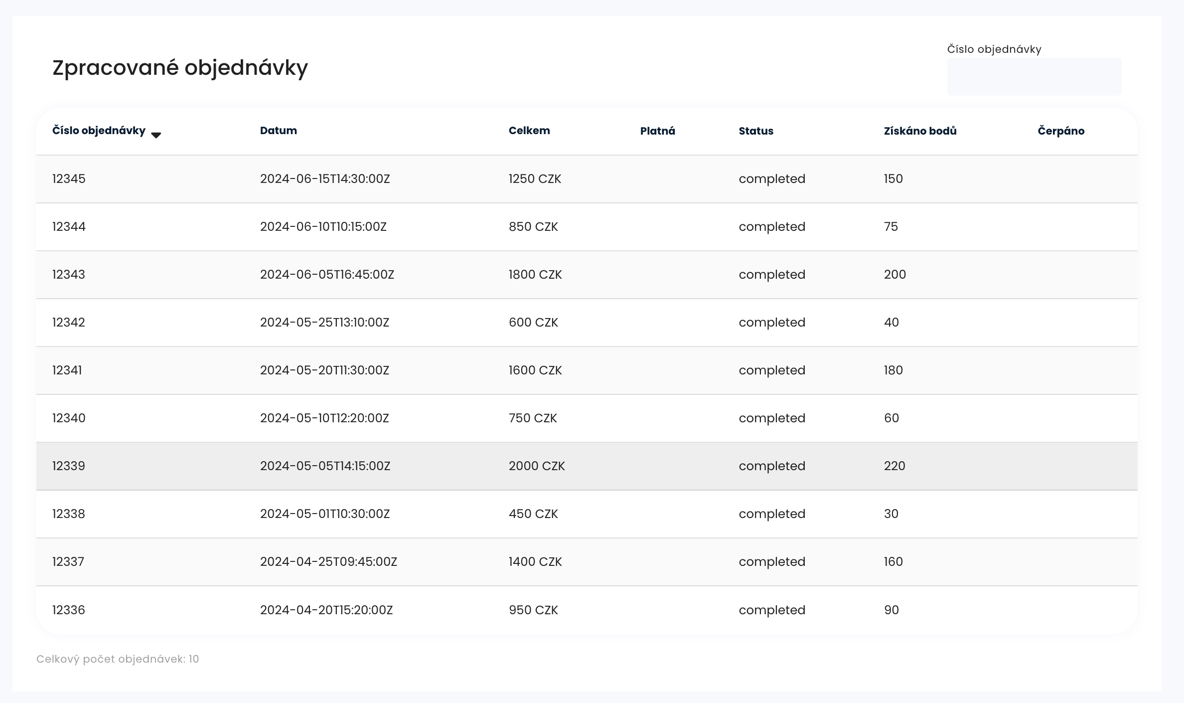 - Lze hledat dle čísla objednávky a řadit podle datumu nebo částky.