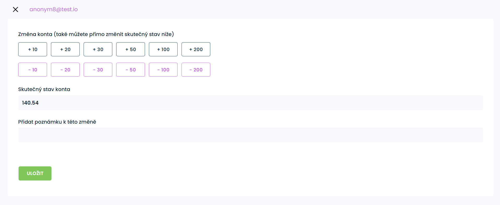 Zde můžete přidávat a nebo ubírat kredity, buď dle předdefinovaných hodnot a nebo můžete zadat své vlastní. Přímo napíšete Skutečný stav konta, pokud půjde o hodnotu s desetinným místem, použijte vždy místo desetinné čárky tečku.
